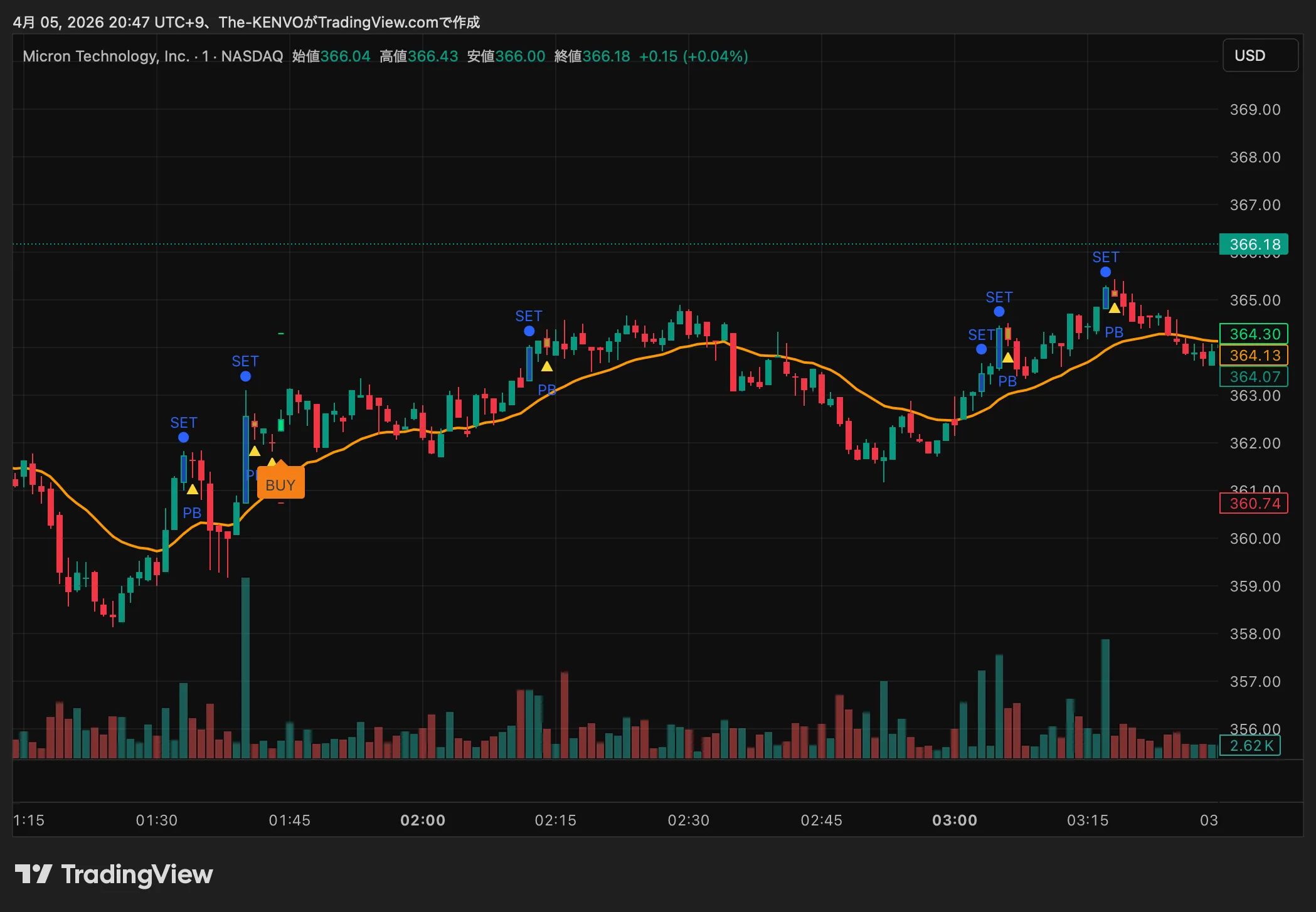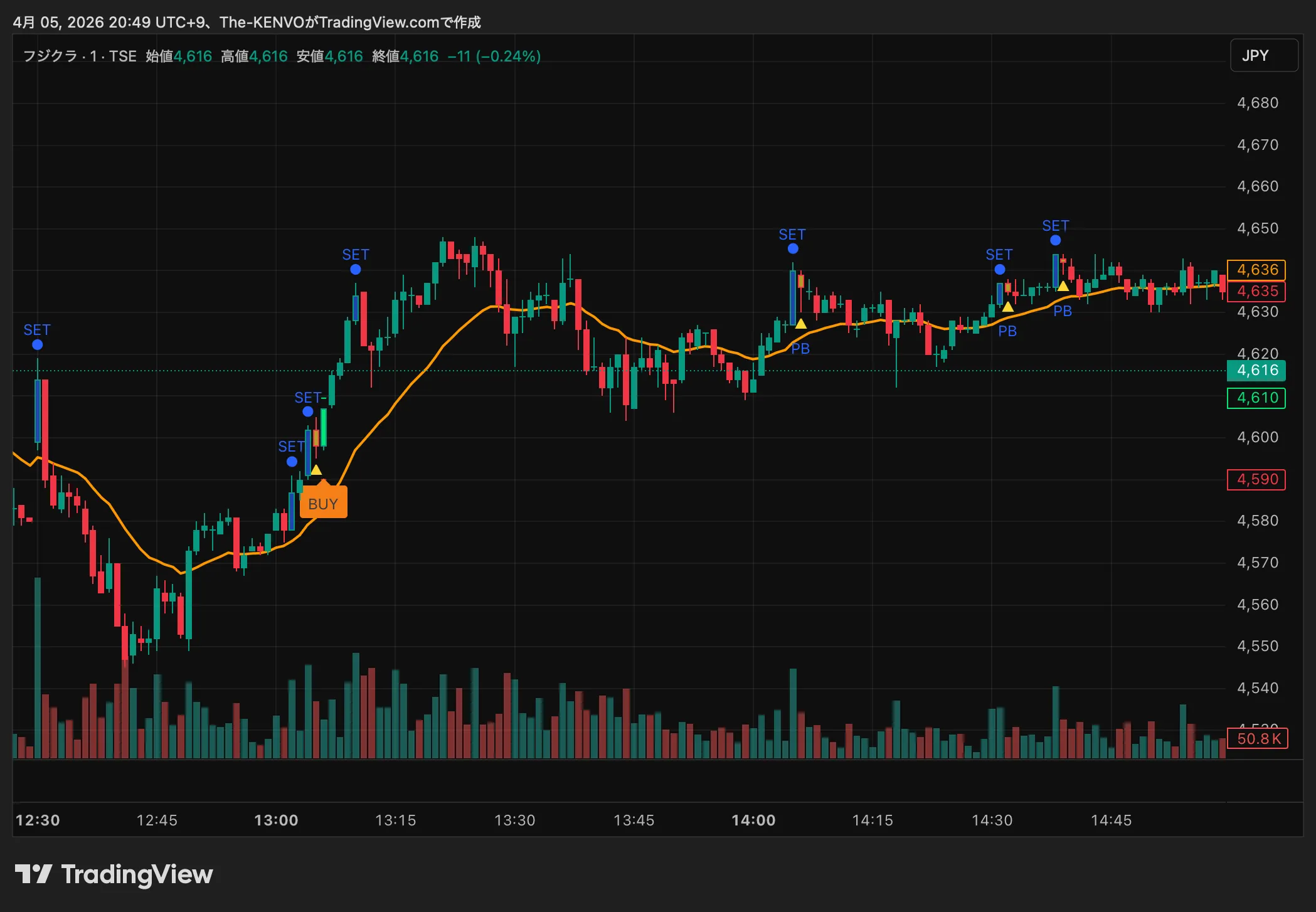 設定に応じて、押し目候補の次足で再上昇確認後に表示されます。