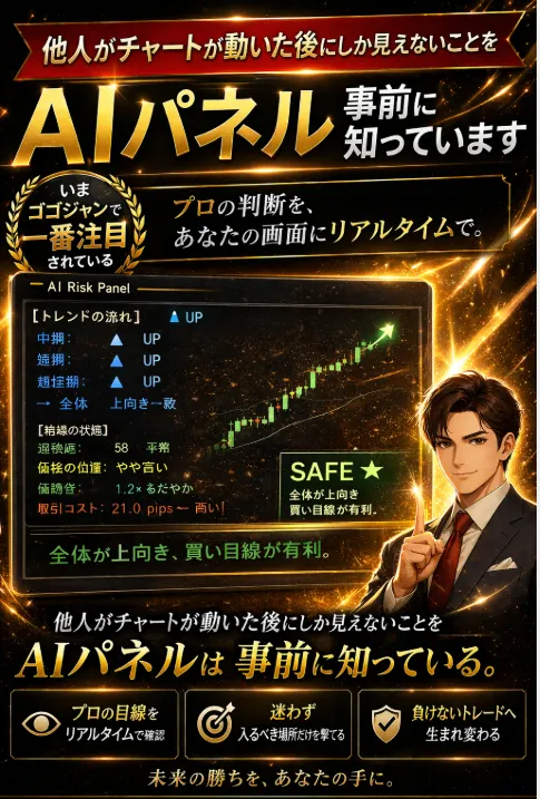 沢山の方からご要望をいただいていたMT5対応ですが、 ようやく形になり無事出品することができました。 今までMT4で使っていた方も、MT5しか使えなかった方も、 どちらにも意味のある内容になっています、 その分しっかり仕上がっています。 それ、あなたの実力不足ではありません その迷いを消すために生まれたのが 画期的なシステムツールAI学習ロジック搭載! 【AI Risk Panel】とは? MT5版天地爆速AIをご購入いただいた方全員に、 このパネルは、 “今の相場がどの状態か”を一目で把握するためのツールです 上昇なのか このツールは エントリーを増やすためのものではありません “負けるトレードを減らすためのツール”です のAI Risk Panelは 「相場の流れを判断してくれる頭脳」 なぜこれが重要なのか?