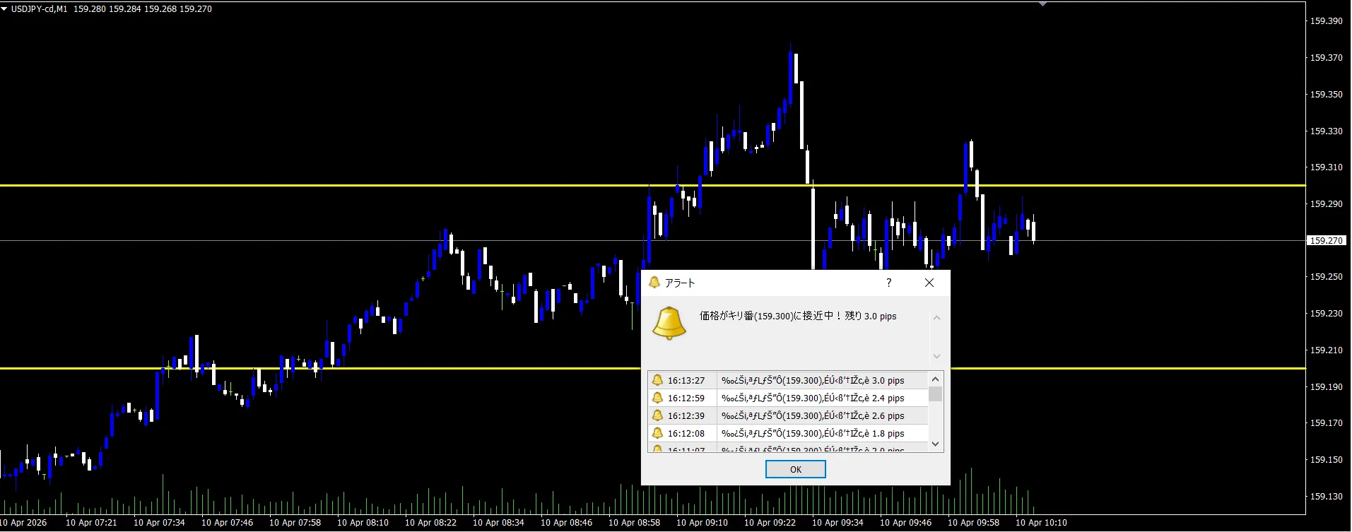 スマホプッシュ通知: 価格が接近した際、お手持ちのスマホ(MT4アプリ)へ即座に通知。チャートに張り付く必要がなくなります。