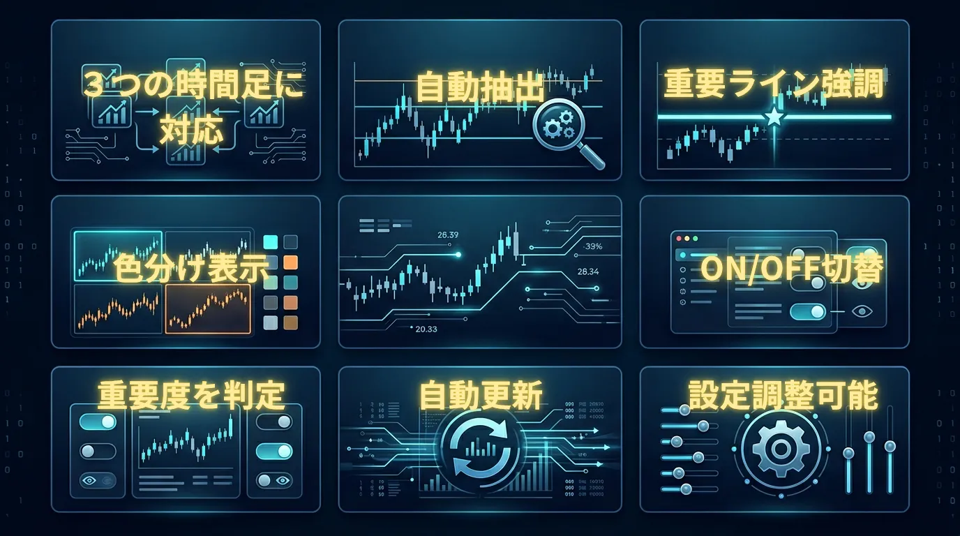 過去チャートの値動きをもとに、重要になりやすい価格帯を自動で抽出し、3つの時間足に対応した水平線をチャート上へ分かりやすく表示します。