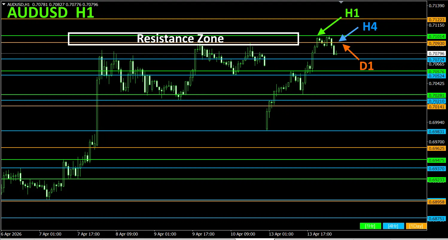 上の図は、AUDUSDの1時間足に、このインジケータを表示させたものです。 0.71000付近に、H1、H4、D1の3本の水平線が重なっており、強いレジスタンスゾーンを形成していることが読み取れます。