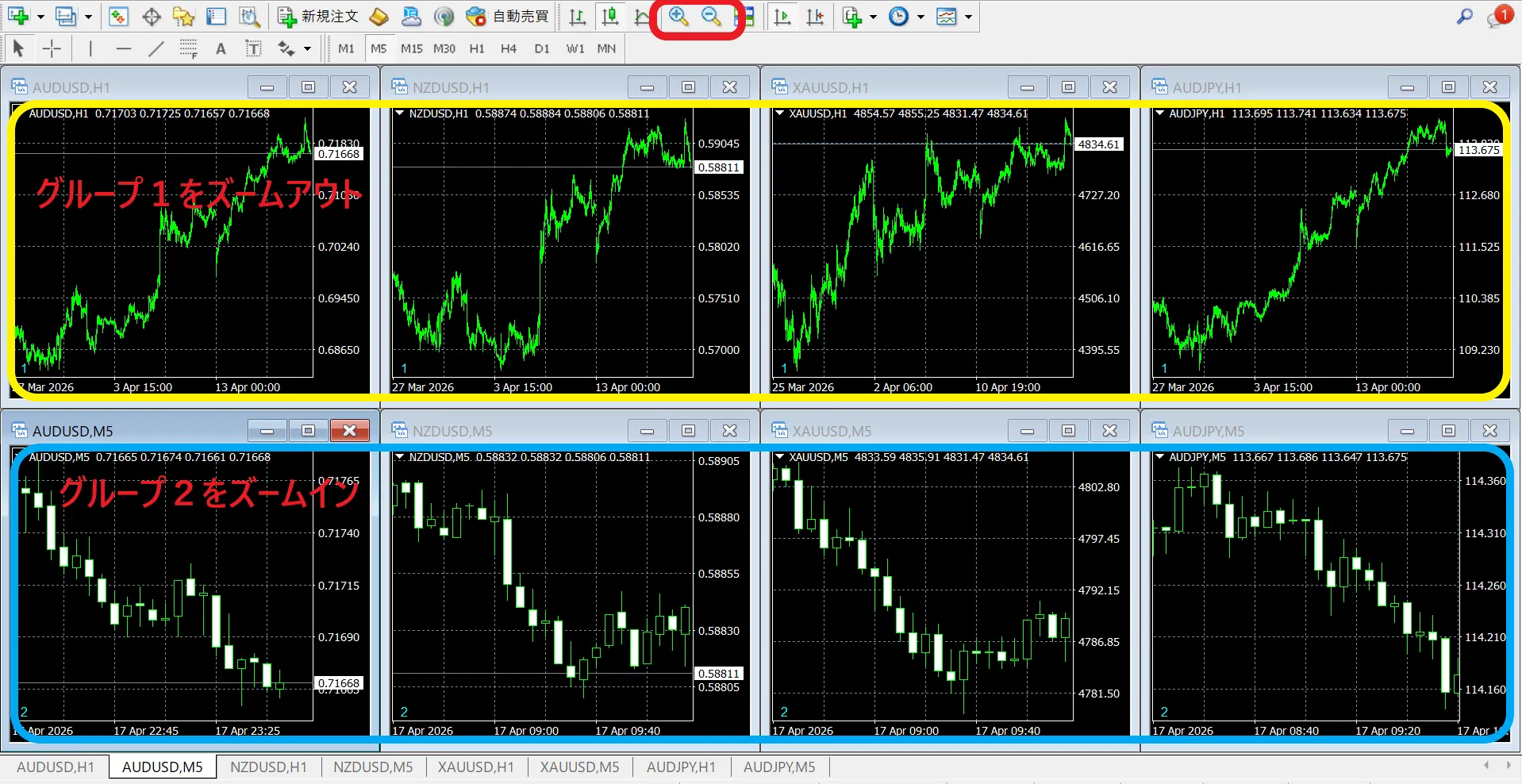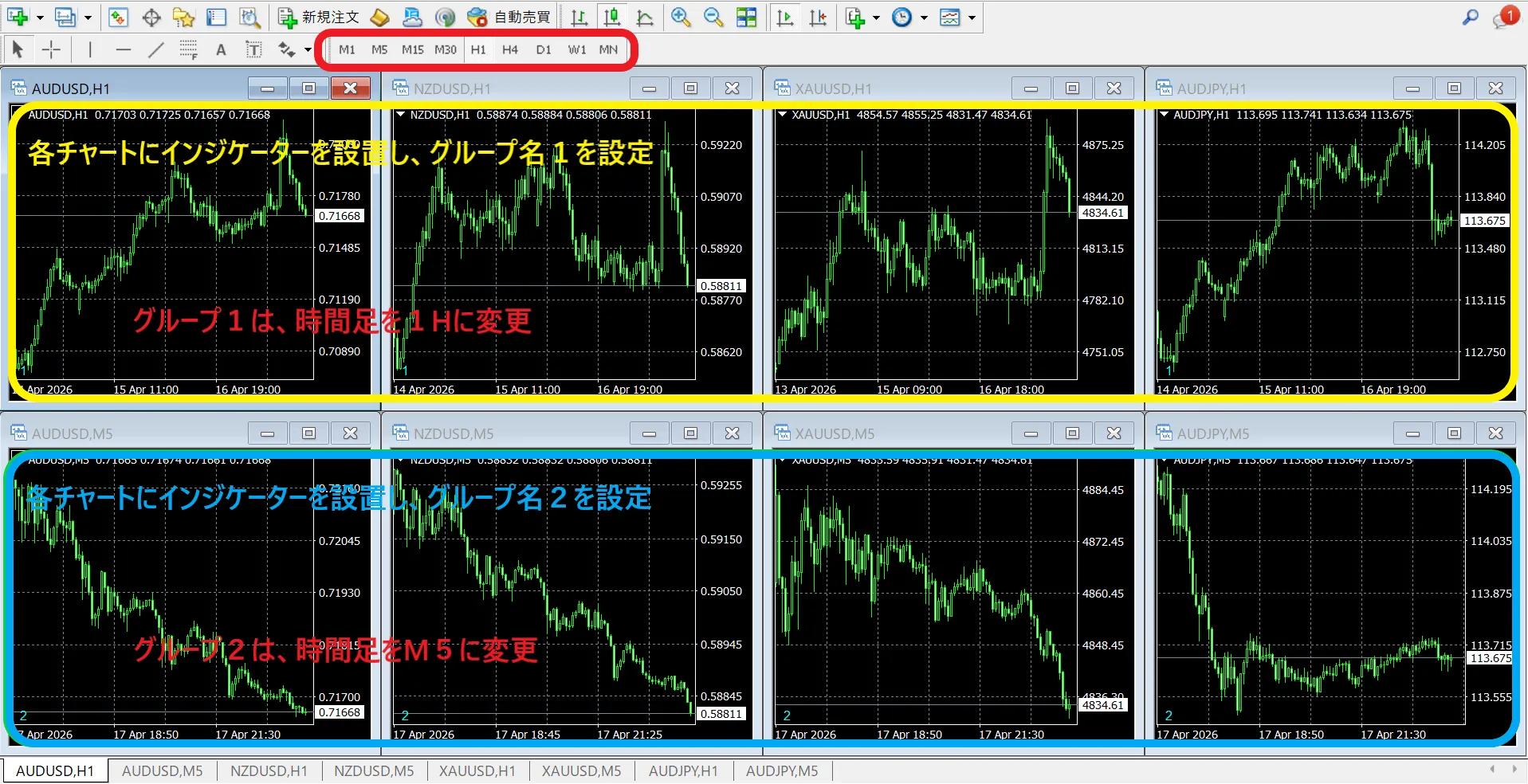 以下は、グループ1とグループ2にチャートを分類し、時間足をグループごとに切り替えた場合です。