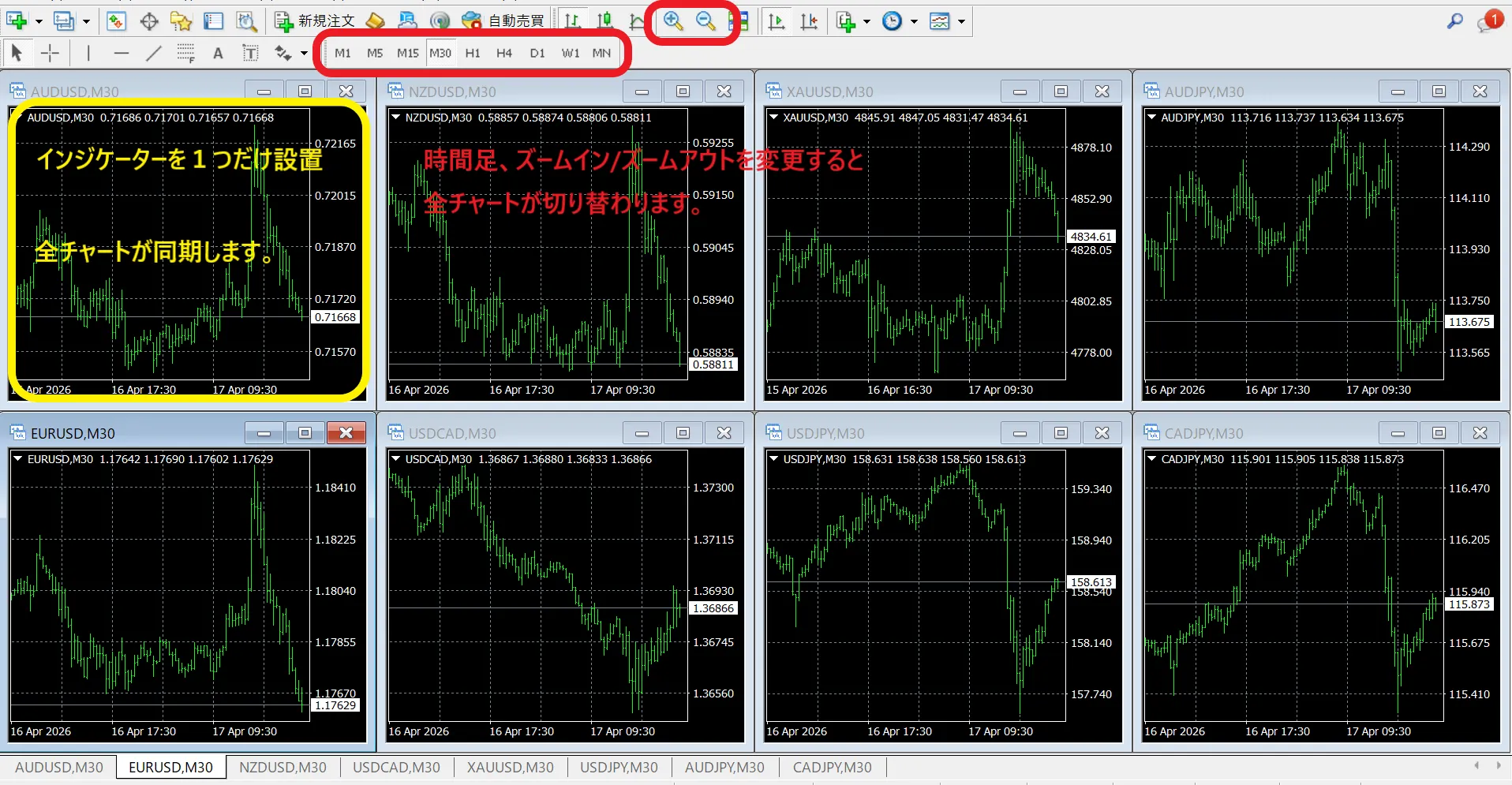 【MT4】各チャートの時間足、ズームイン/ズームアウトを同期する