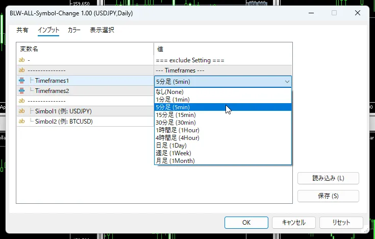 設定は非常にシンプルです。複雑な操作は一切不要で、直感的に設定いただけます。 同期から除外する時間足: プルダウン(通貨ペアは入力)で簡単に選択可能