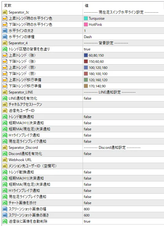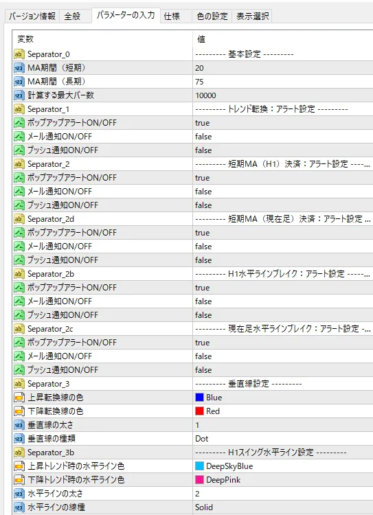 主要な数値(トレンド判定やライン表示条件など)はパラメータで調整可能です。