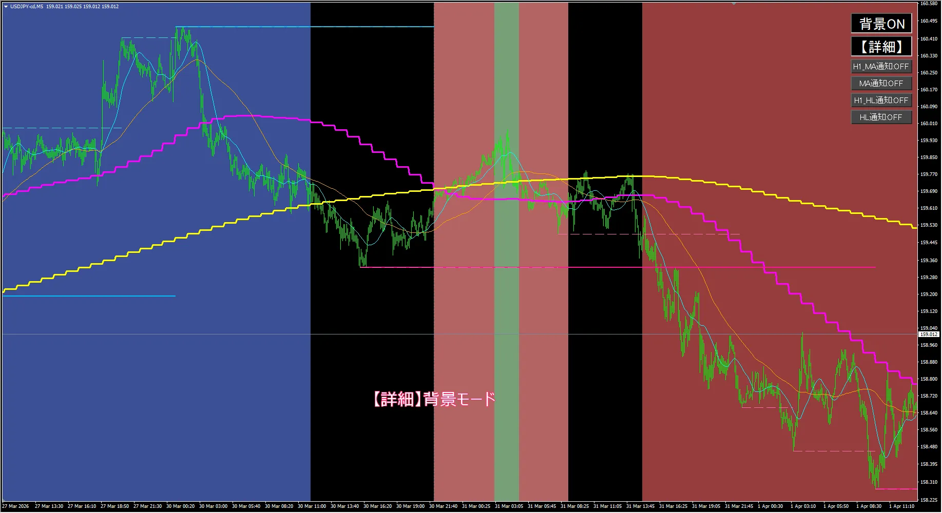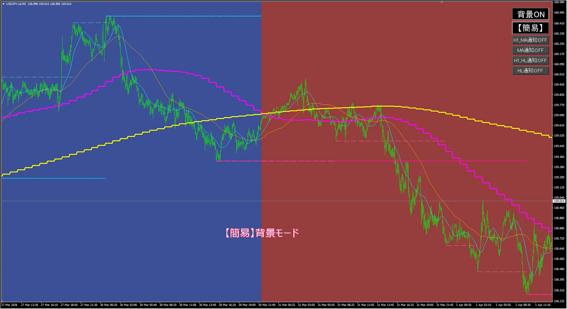 トレンド背景表示でひと目判定:H1足のトレンド状態を最大7段階で色分け。簡易モード/詳細モードを切替可能で、初心者から中級者まで使い分けOK