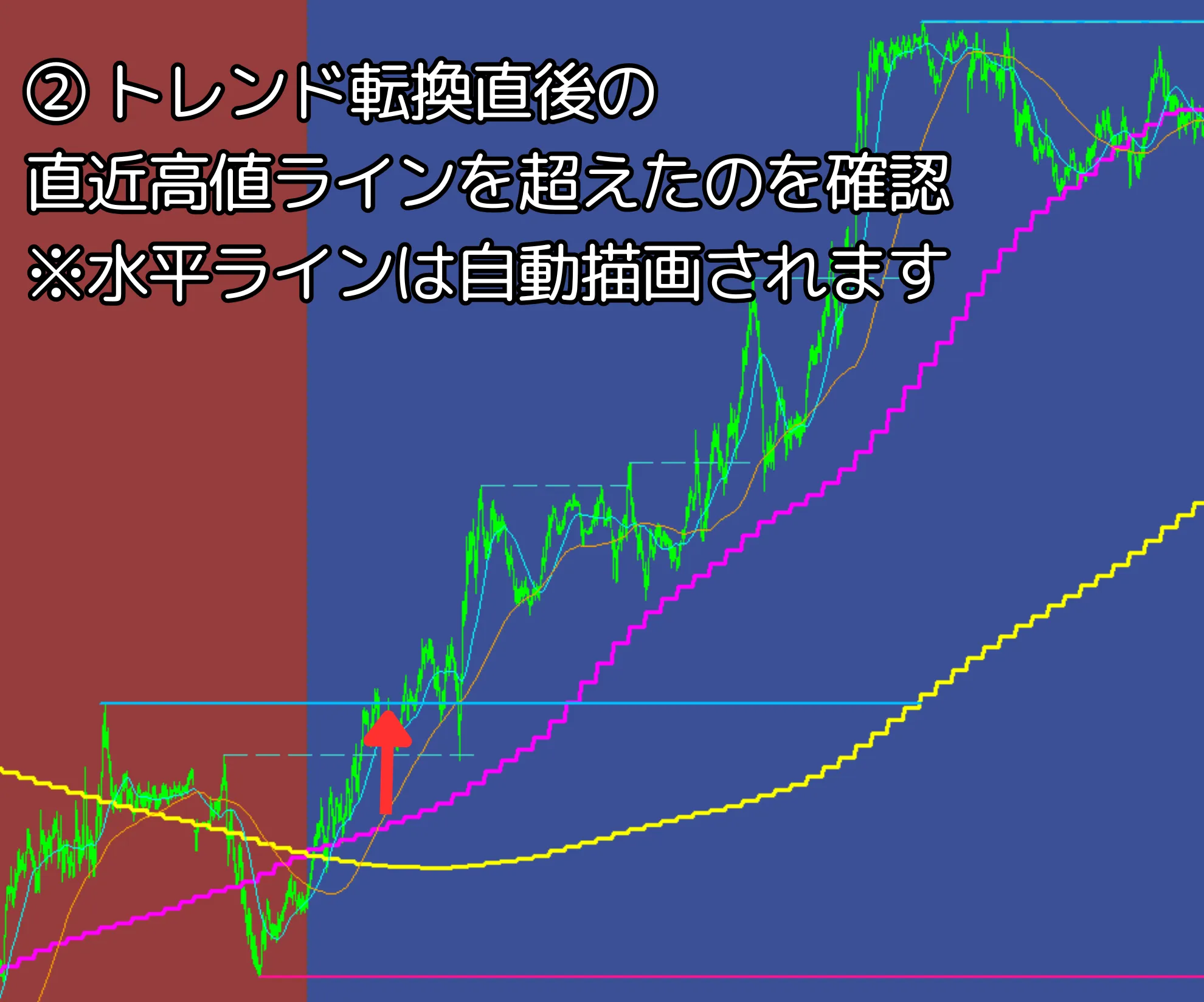 ② トレンド転換直後の直近高値ラインを超えたのを確認