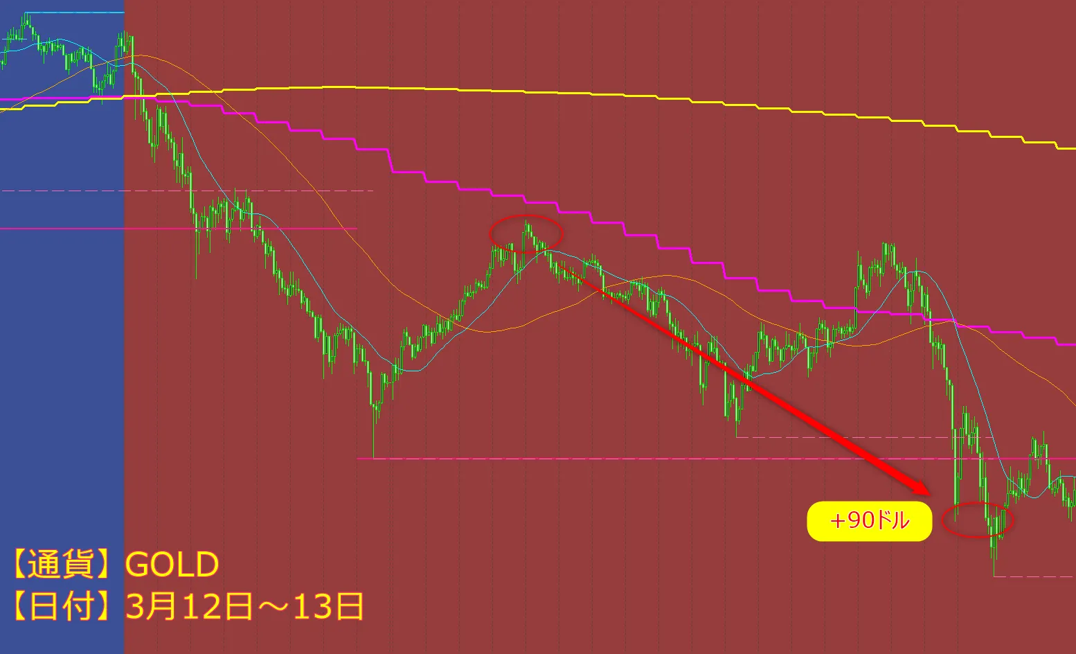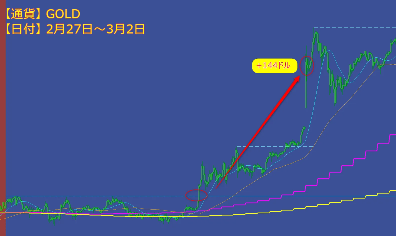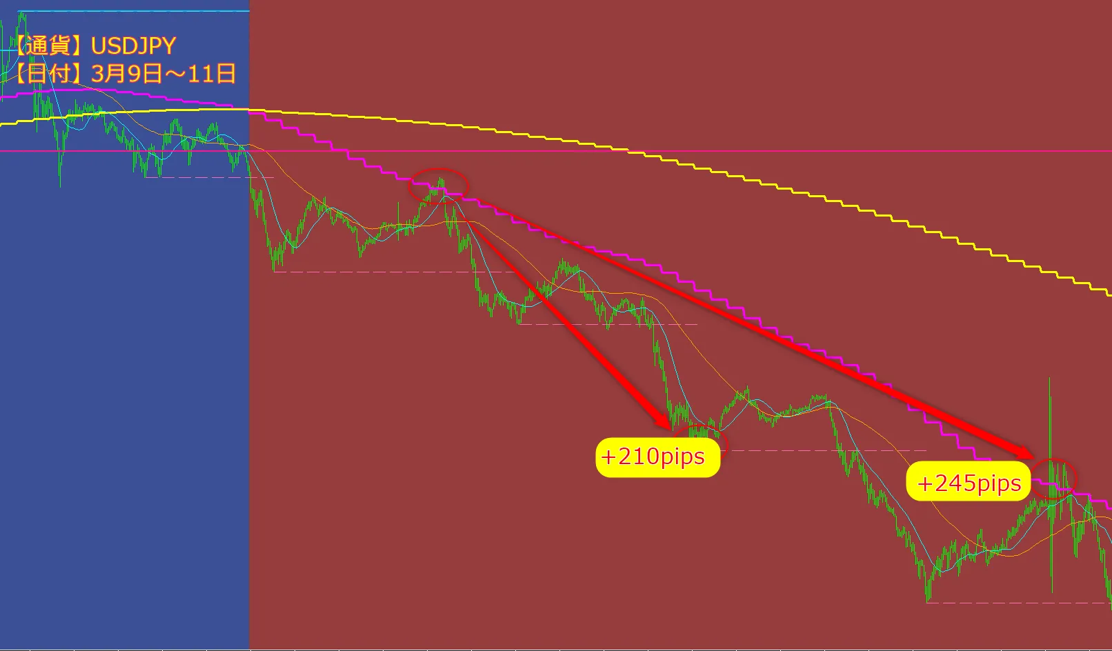 つまり、シンプルかつ王道でありながら、実際に勝ち続けているトレードの型を、インジケーターとして形にしたものです。