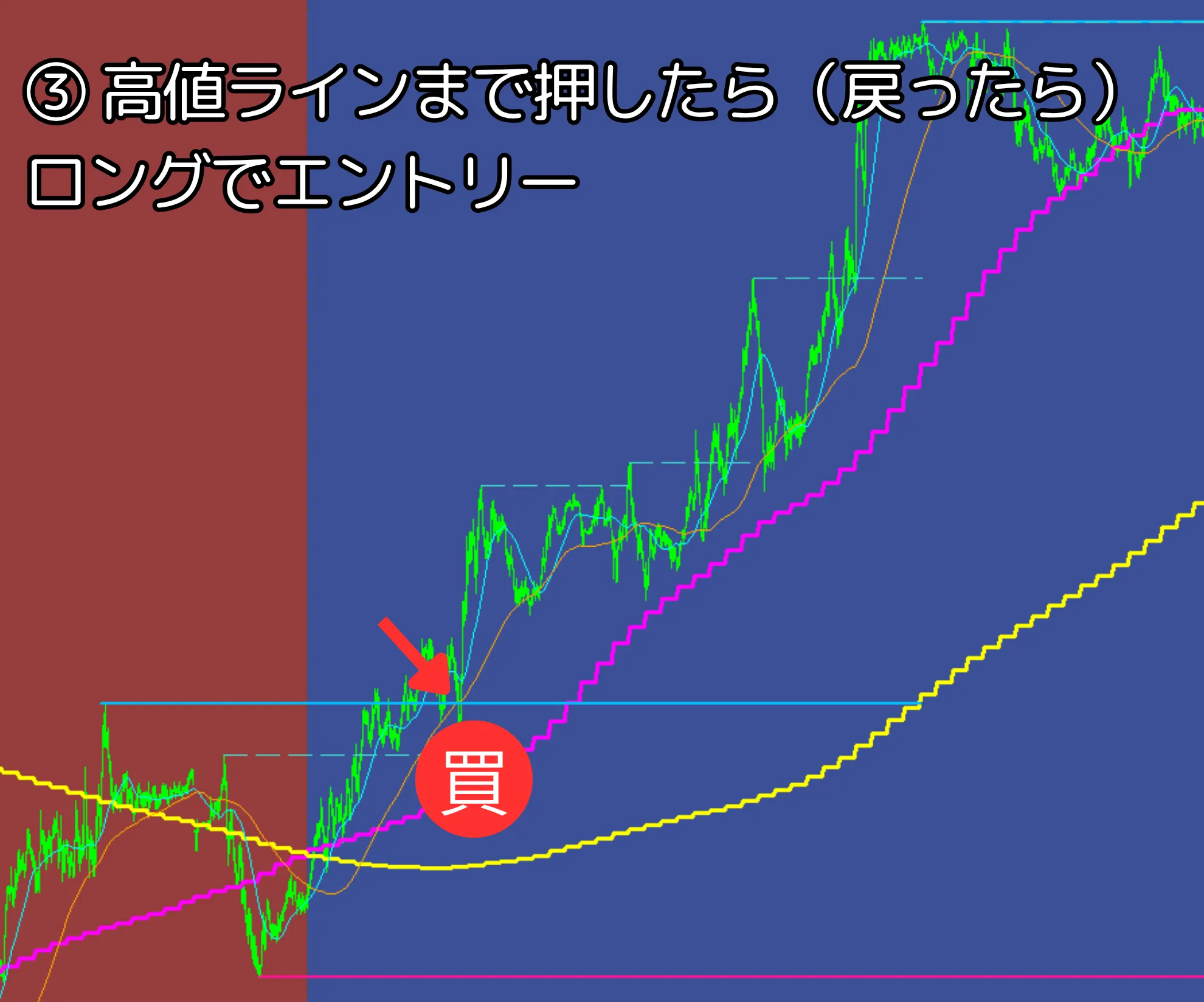 ③ 高値ラインまで押したら(戻ったら)ロングエントリー