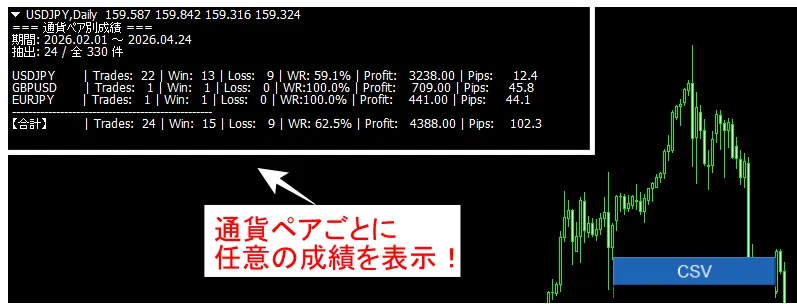 6-1. 表示イメージ チャート左上に以下のように表示されます。 === 通貨ペア別成績 === 期間: 2026.01.01 ~ 2026.12.31 抽出: 128 / 全 128 件 USDJPY | Trades: 45 | Win: 28 | Loss: 17 | WR: 62.2% | Profit: 1250.00 | Pips: 125.5 EURUSD | Trades: 32 | Win: 18 | Loss: 14 | WR: 56.3% | Profit: 830.00 | Pips: 83.0 XAUUSD | Trades: 15 | Win: 9 | Loss: 6 | WR: 60.0% | Profit: 420.00 | Pips: 42.0 ------------------------------------------------- 【合計】 | Trades: 128 | Win: 78 | Loss: 50 | WR: 60.9% | Profit: 3200.00 | Pips: 320.0