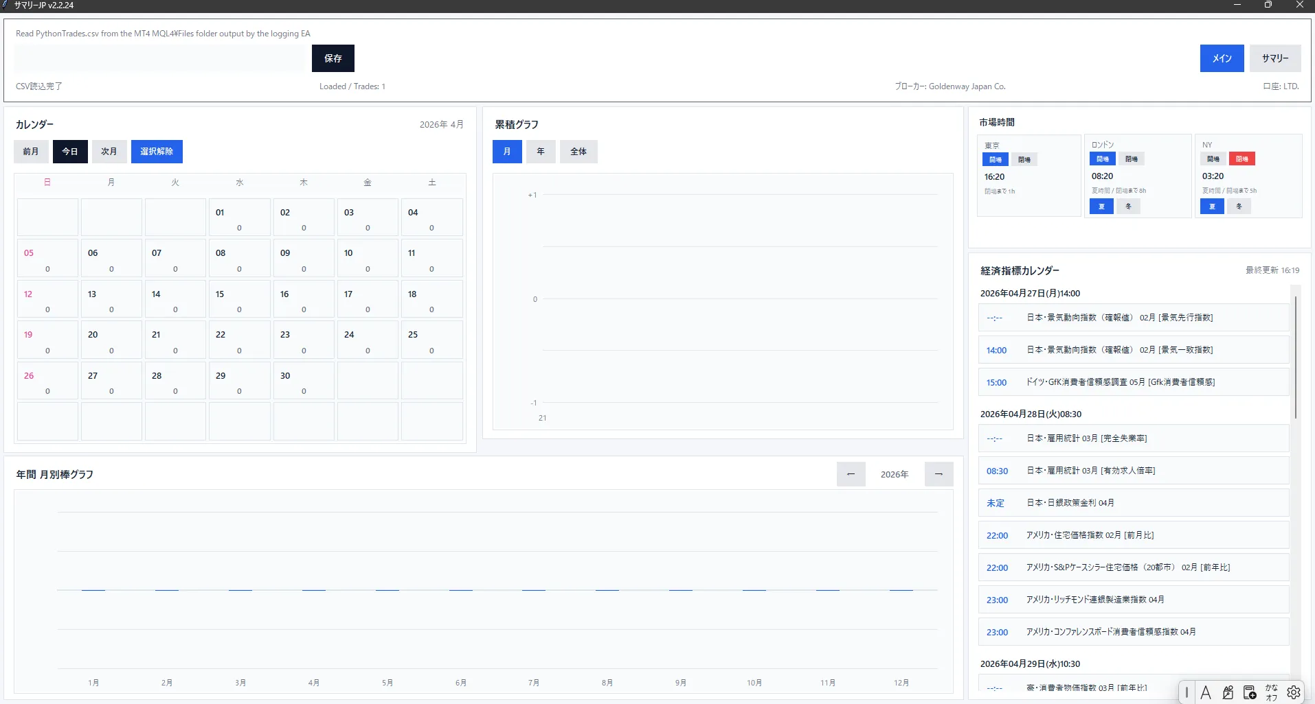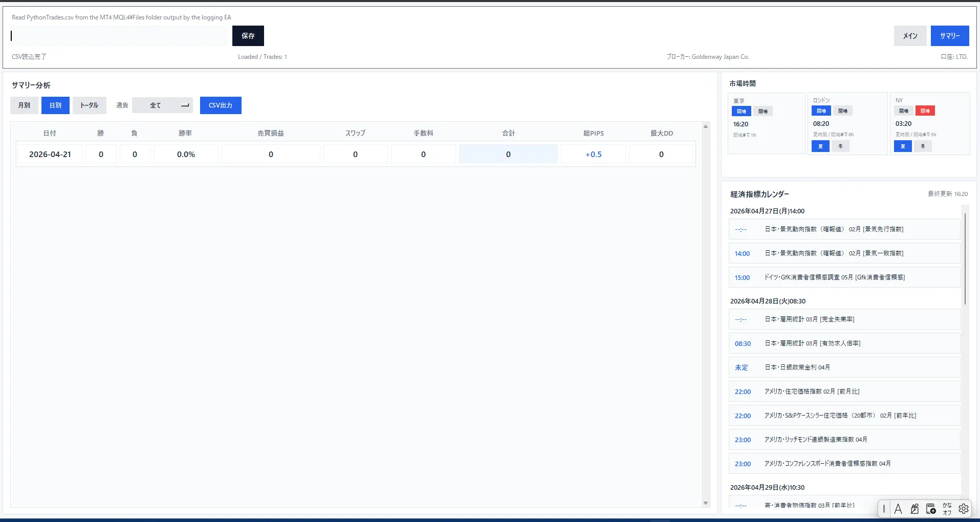 ※本商品は、MT4専用ログ出力EAと、Python製Windows実行アプリのセットです。MT4から出力された取引履歴CSVをWindowsアプリで読み込み、損益・勝率・累積グラフ・日別成績・経済指標カレンダーなどを確認できます。Windows以外では起動できません。詳しい設定の仕方はマニュアルに記載しております。必ずご確認ください。