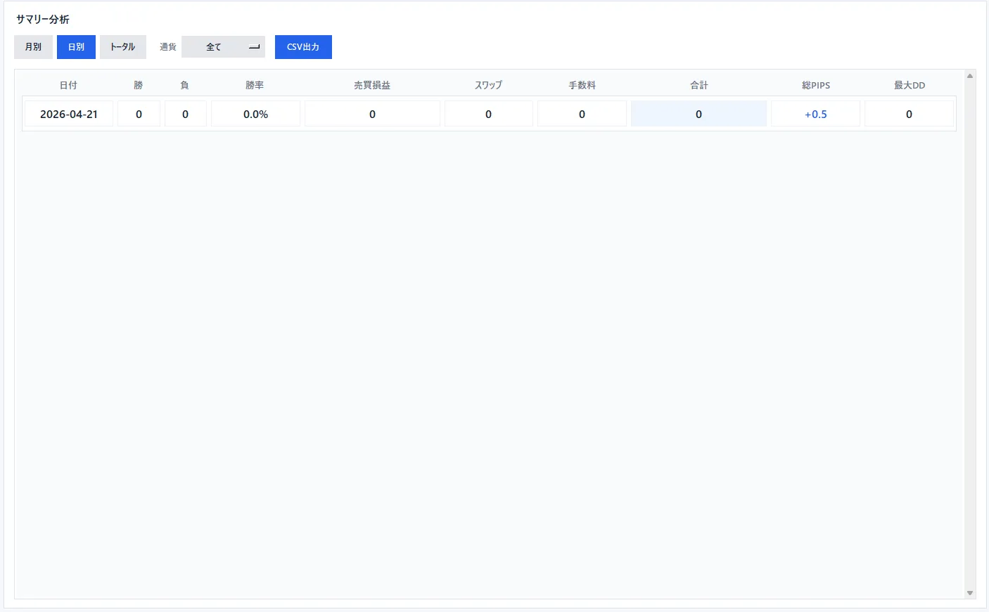サマリーページでは、月別、日別、通貨別でソート・分析できます。(最大DDはMT4とアプリを同時起動でデータ取得)
