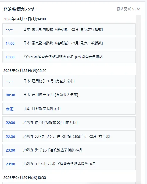 経済指標カレンダー(カレンダーは外部のサイトに依存します。将来的にURL変更等になれば、表示されなくなる可能性もあります)