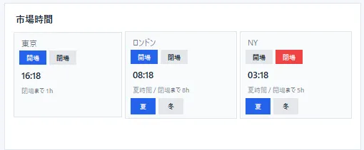 ②各メイン市場の時間や開場閉場状況。夏時間冬時間の切り替え付