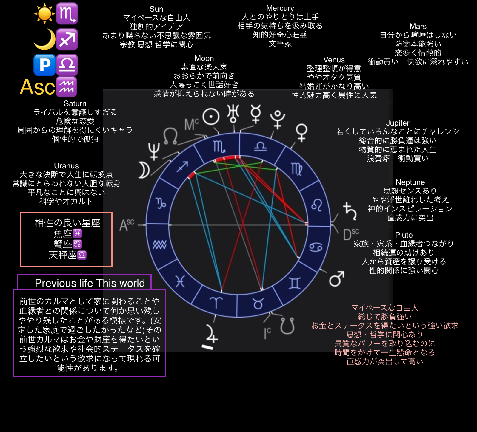 その2つの工程によって、その人の持って生まれた星周りや性格を把握し、現況を表しやすい手相との比較において、その人の置かれてる現状や特性について鑑定判断させていただきます。鑑定の根拠はすべて西洋占星術によるものです。