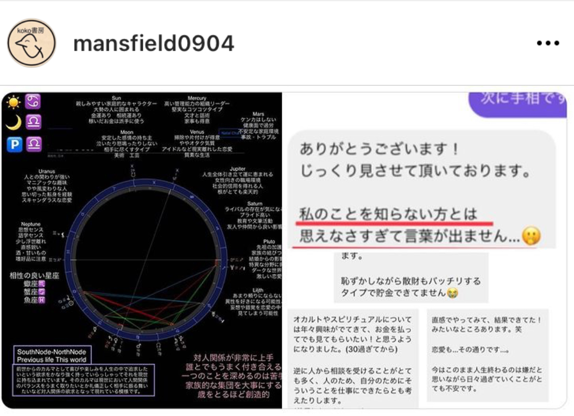 某サイトで鑑定予約待ち195人を記録したmansfieldのホロスコープ&手相鑑定