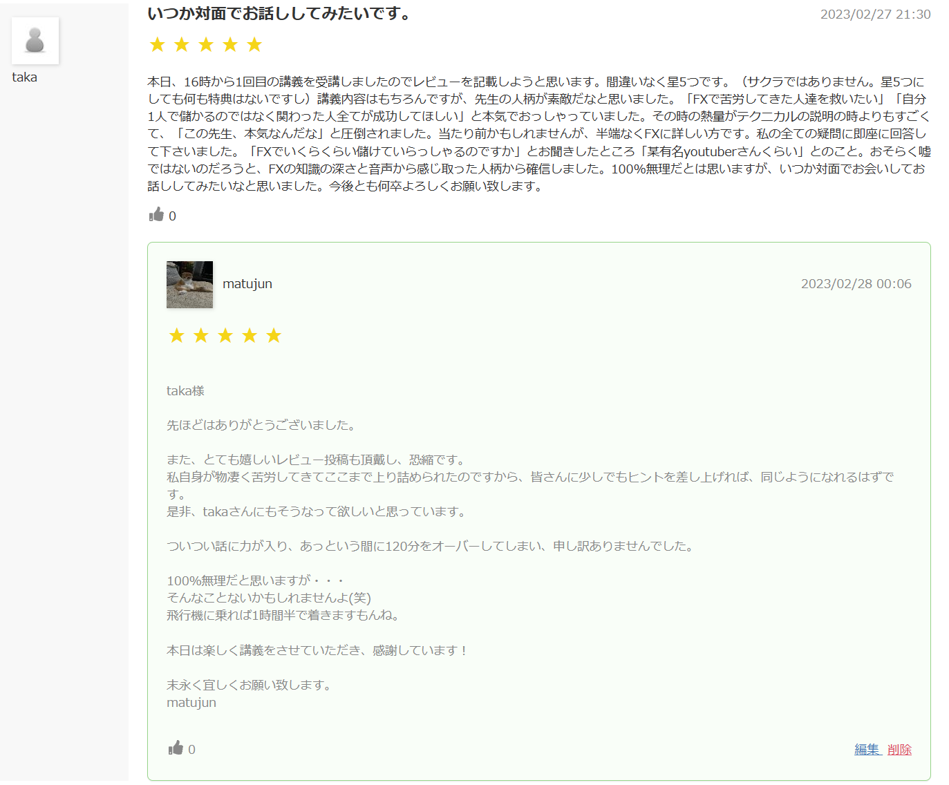 ご購入者様と一緒に、チャネルラインやトレンドラインなどを引きながらこのような場面で講義をしています。