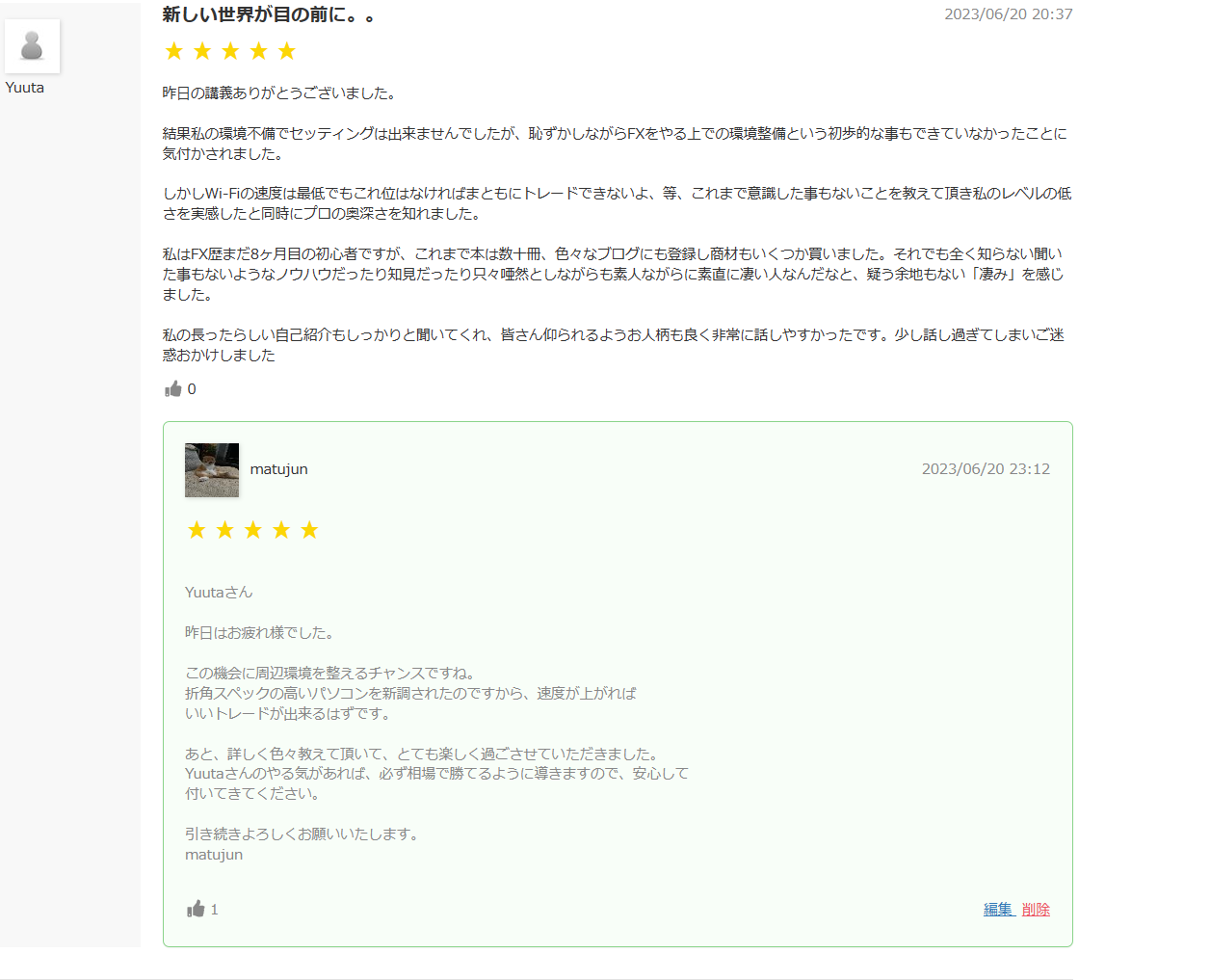 また、相場は分単位での勝負ですので、ある程度のPCスペック(メモリが16GB以上が望ましい)と通信環境が必要です。取引環境の事もそうですが、FX相場の基本的な言葉や取引市場の事なども最低限はご自分で勉強してください。(基本的なことも教えてほしいという方には、追加講義もお受けします)