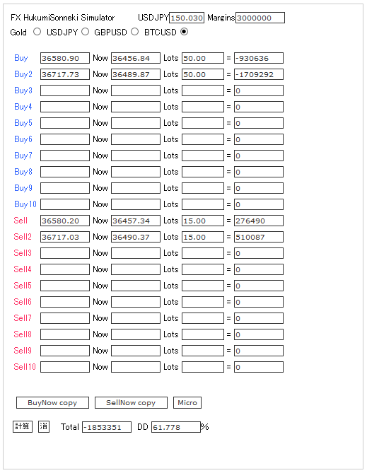 マイクロの口座はロットを入力した後計算ボタンを押す前にMicroボタンを押して下さい。押すたびに一括で100で割るので、再入力時には気を付けて下さい。
