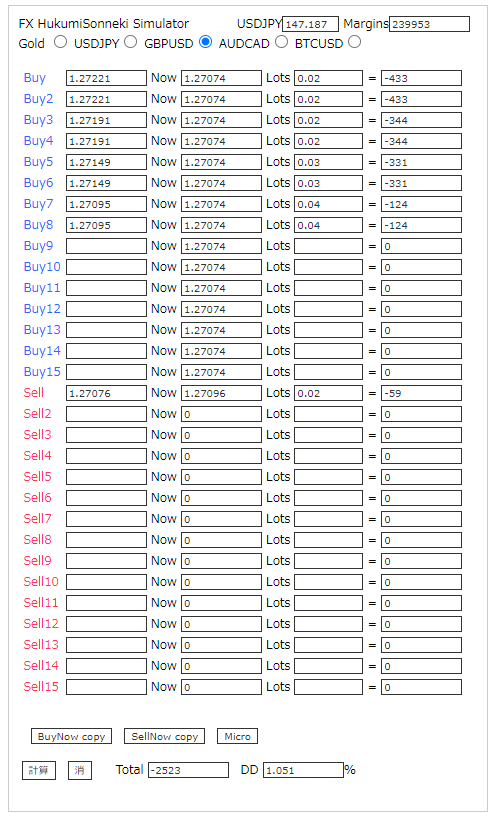FXの含み損益を概算(簡易計算)するシミュレーターです。ショートロングそれぞれ30個までのポジションに対応してます。